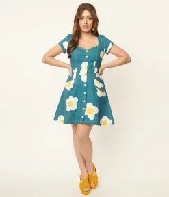 This 1970s style flare dress is crafted in a blue denim and features sunny side up eggs printed in a floral pattern. Complete with a button up front and front pockets.