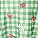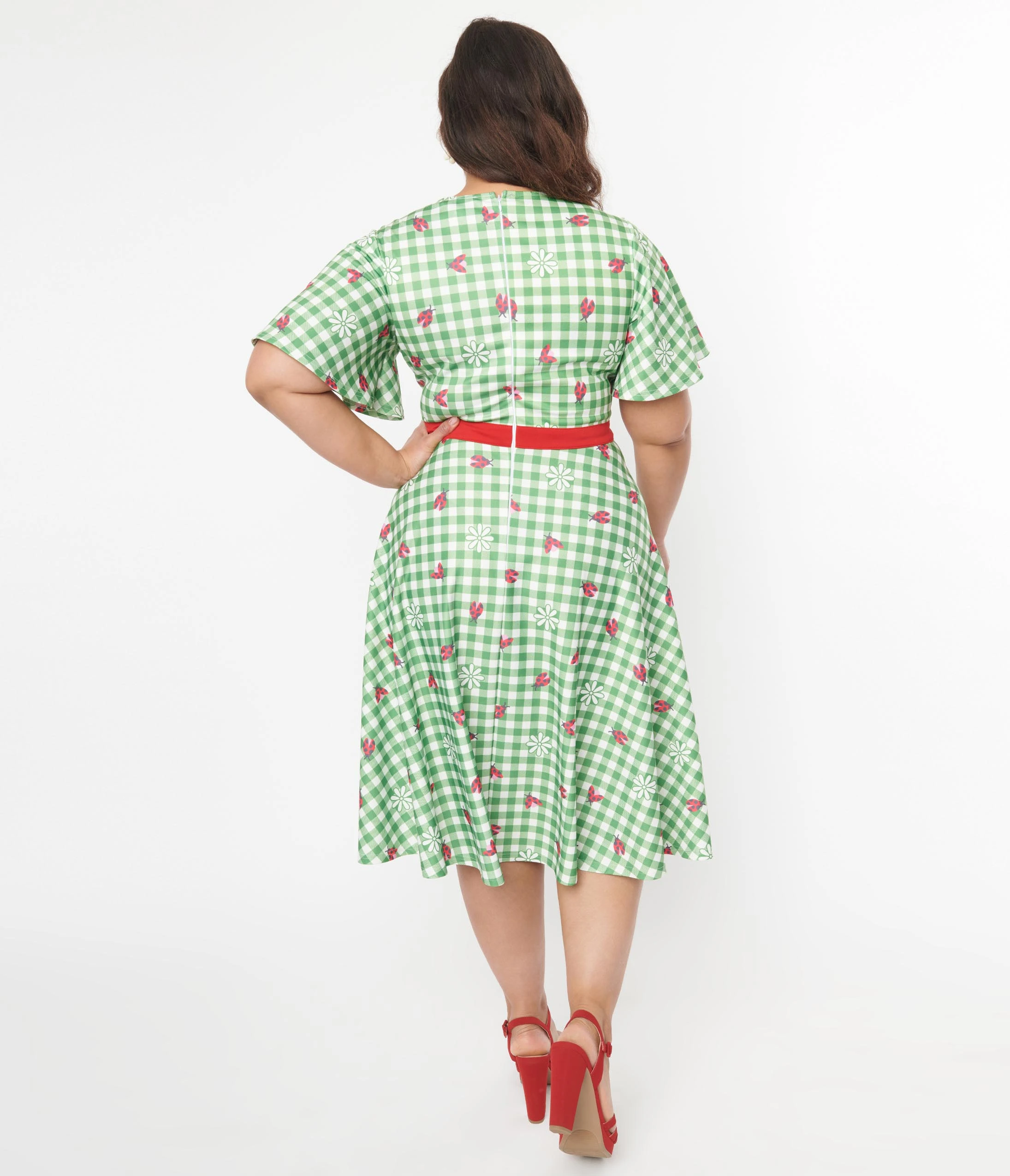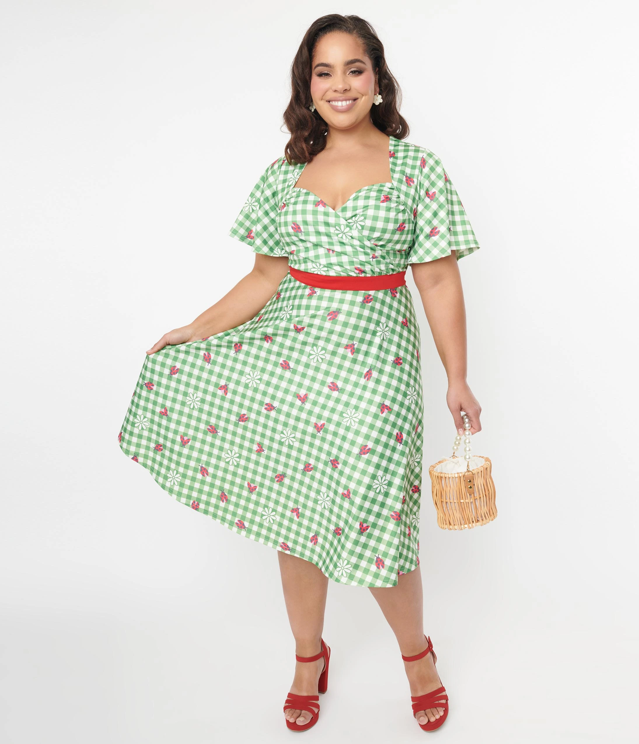 This charming 1950s style swing dress is crafted in a woven stretch blend boasting ladybugs and daisies throughout the green and white gingham, backdrop. Featuring short flutter sleeves that frame the surplice sweetheart neckline and a full swing skirt complete with a back zipper and hook.