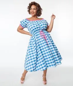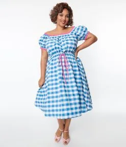 This adorable 1950s style plus size swing dress is a fabulous woven frock crafted boasting a gorgeous blue and white gingham pattern. The daring off the shoulder neckline is framed with sweet pink frill lined puff sleeves that feature elastic cuffs for comfortable wear. The self-tie waist sweeps into the swing skirt, perfecting the summer silhouette!