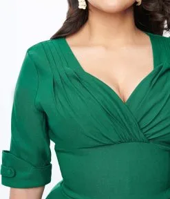 Let Delores get domestic with you, darling. A bewitching emerald green swing dress rich in 1950s vintage appeal fresh from Unique Vintage, Delores is unparalleled! Boasting a gathered surplice V-neckline, trim and tailored half sleeves with darling button details and a thick-banded natural waistline that creates a minimized silhouette, this vintage green dress is sure to flatter your figure. An ample A-line swing skirt billows to knee length in soft pleats, zipping slyly up the back. Crafted in a supremely soft stretch blend in stunning retro structure, this green vintage dress forms an understated yet flattering design. You’ll be fabulously floored by the authentic look of this nice-girl-next-door vintage reproduction dress!