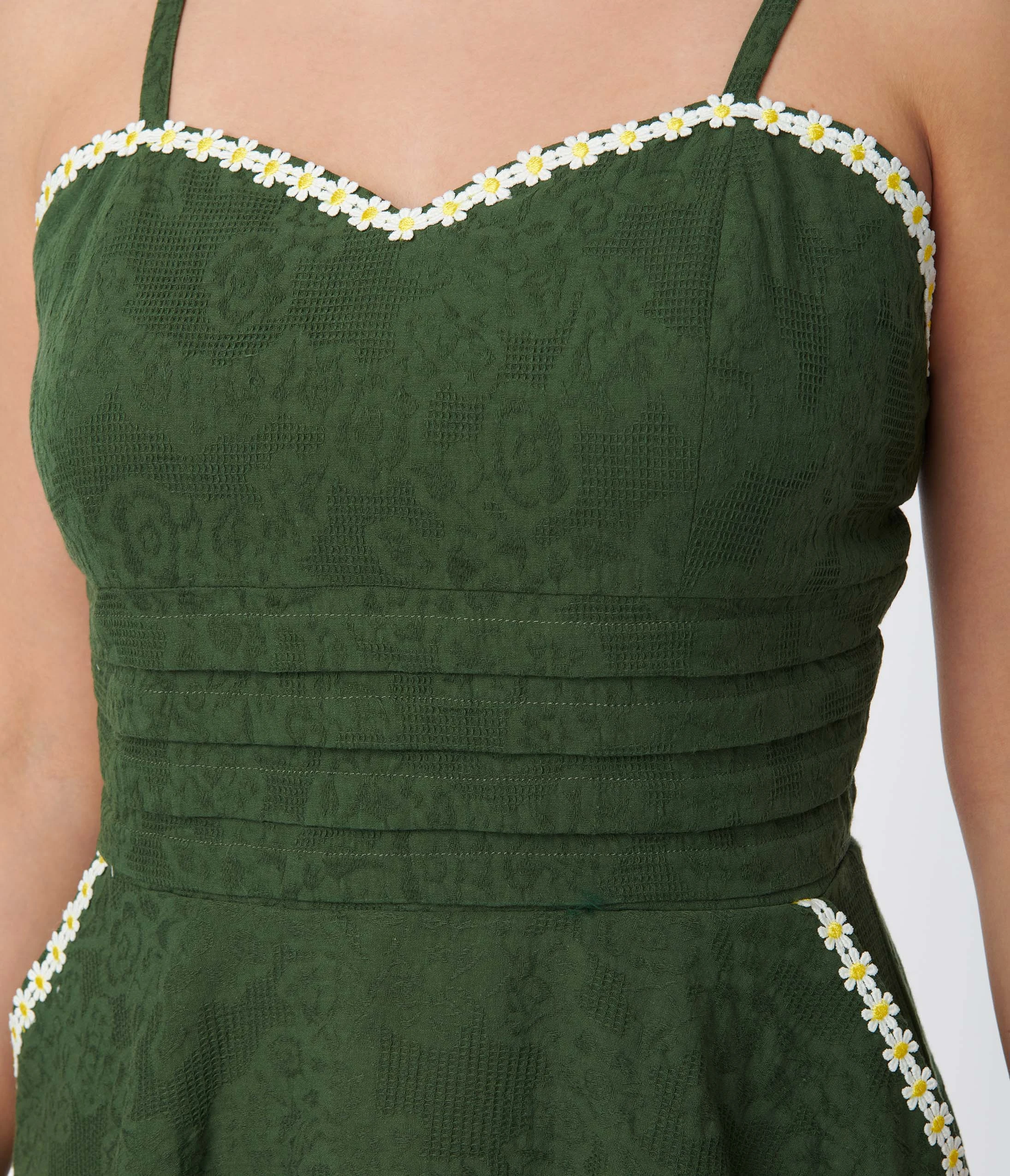 Crafted in a green color with a subtle woven floral pattern stitching throughout, this flare dress features a sweetheart neckline, secured with adjustable spaghetti straps while the waist is cinched with a back zipper. The flare skirt is outfitted with side pockets.