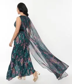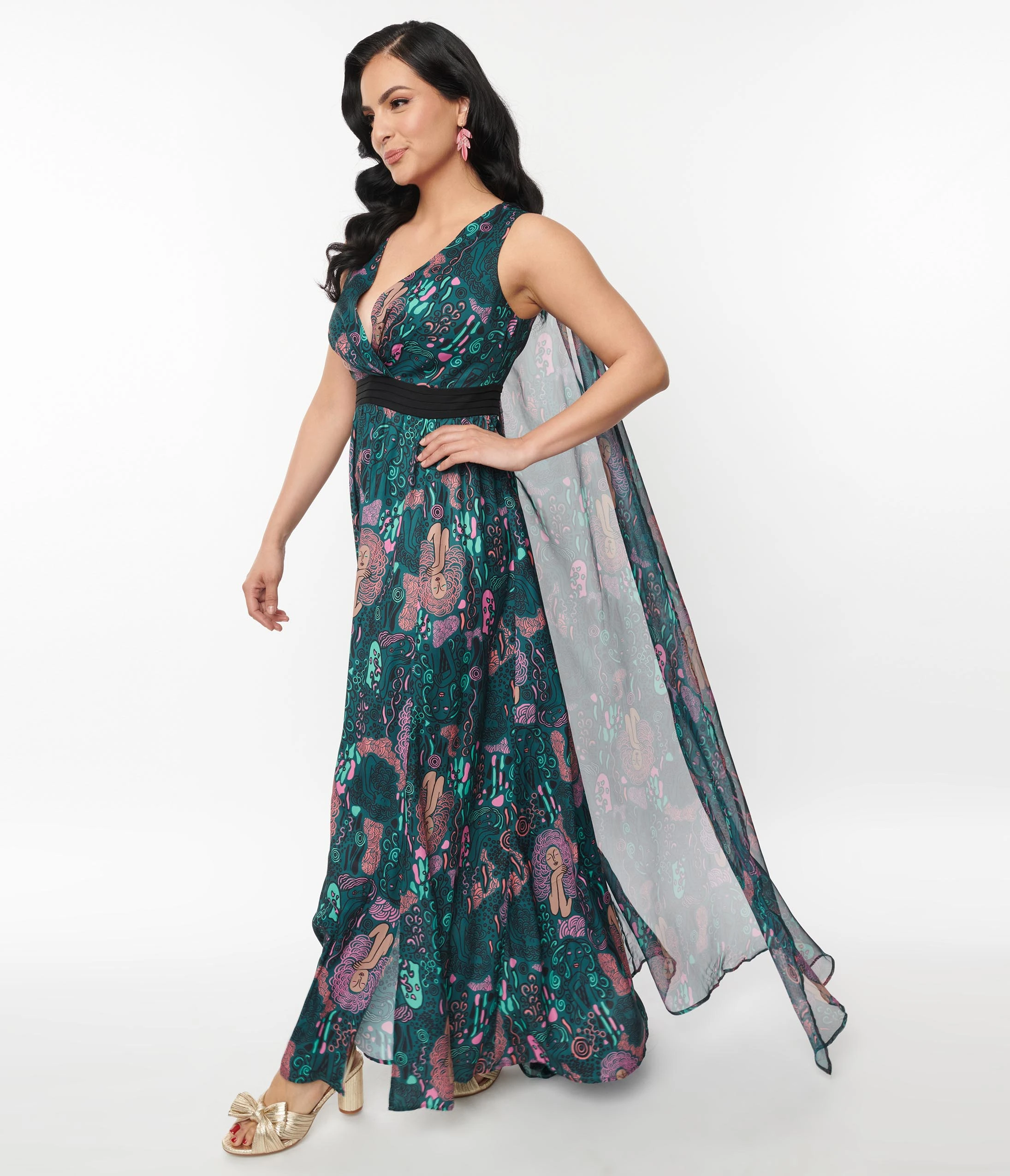A gorgeous sleeveless maxi 1960’s style silhouette crafted in a smooth and lightweight teal green woven fabric that dances beautifully with outlined figures of women. Complete with a black contrast band under the bodice and a back zipper that nips in the empire waist. Outfitted with an attached cape made of chiffon-style fabric that will help glide you through any party!