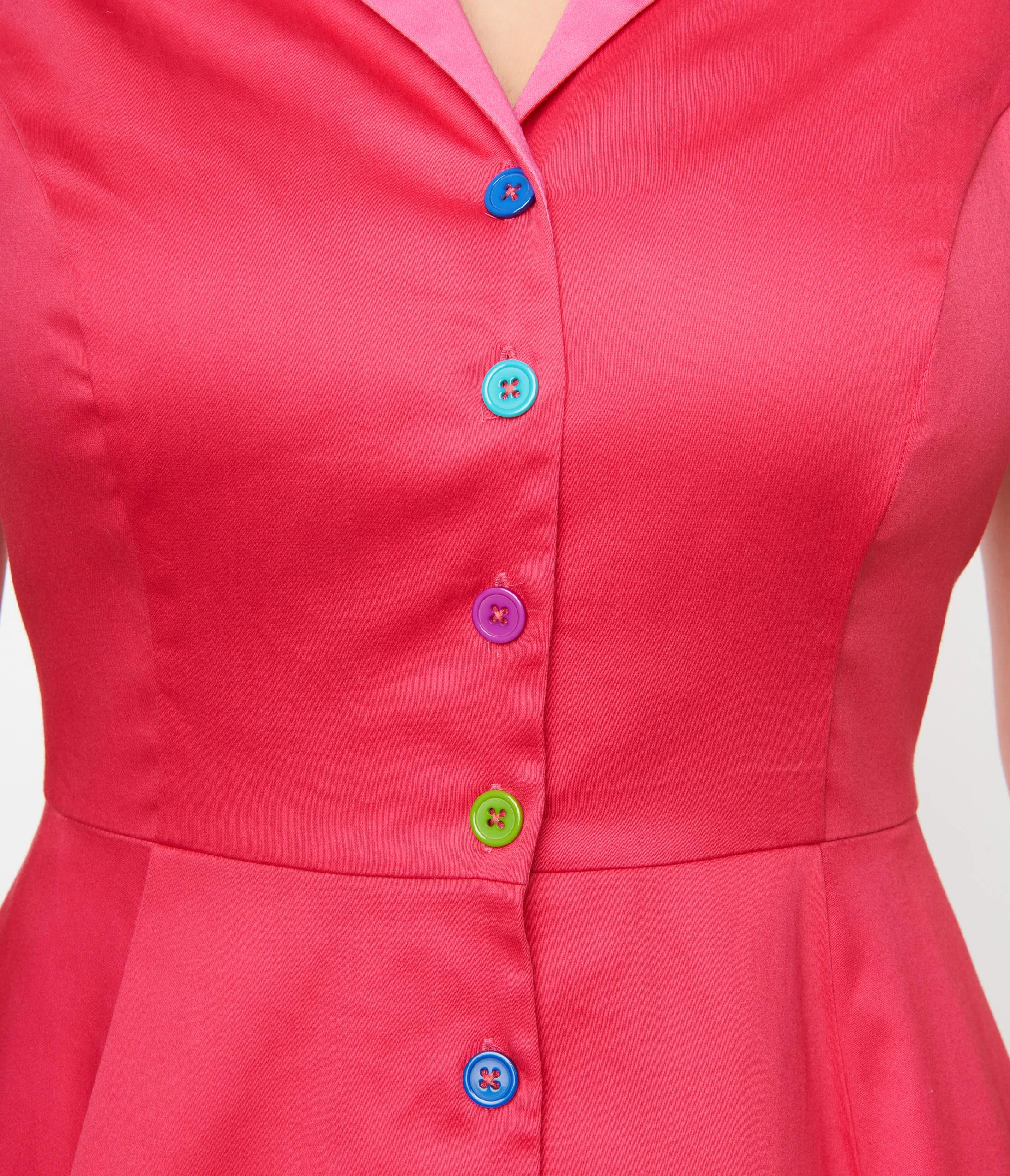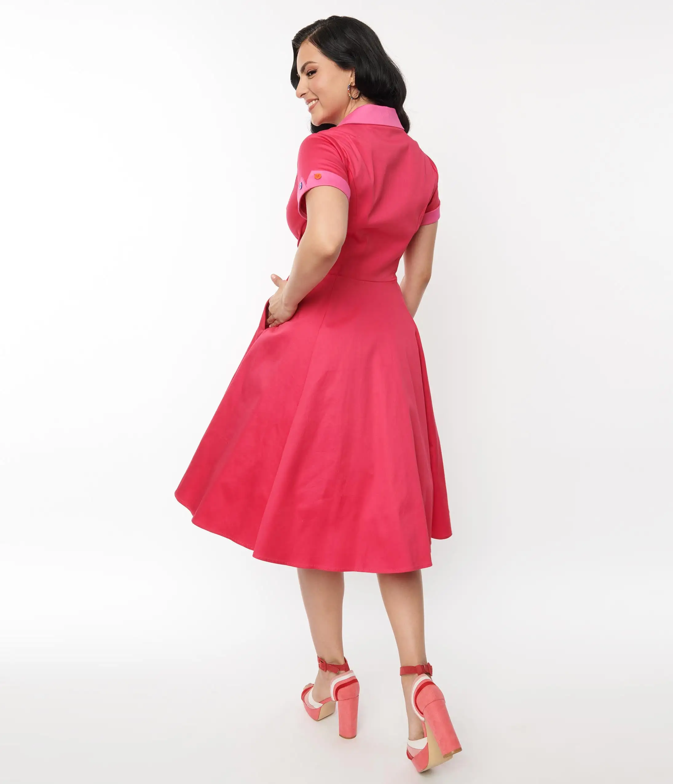 A beautiful 1950’s style swing dress crafted in a lightweight hot pink cotton with a colorful button up bodice leads to a classic collar, framed by pink contrast short sleeves and a seamed waist. The swing skirt drops to your knees, complete with side pockets.