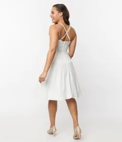 This gorgeous 1950s style bridal swing dress is crafted in a stunning ivory woven fabric, and boasts adjustable spaghetti straps, and a detachable ivory capelet, while the swing length skirt boasts side pockets!