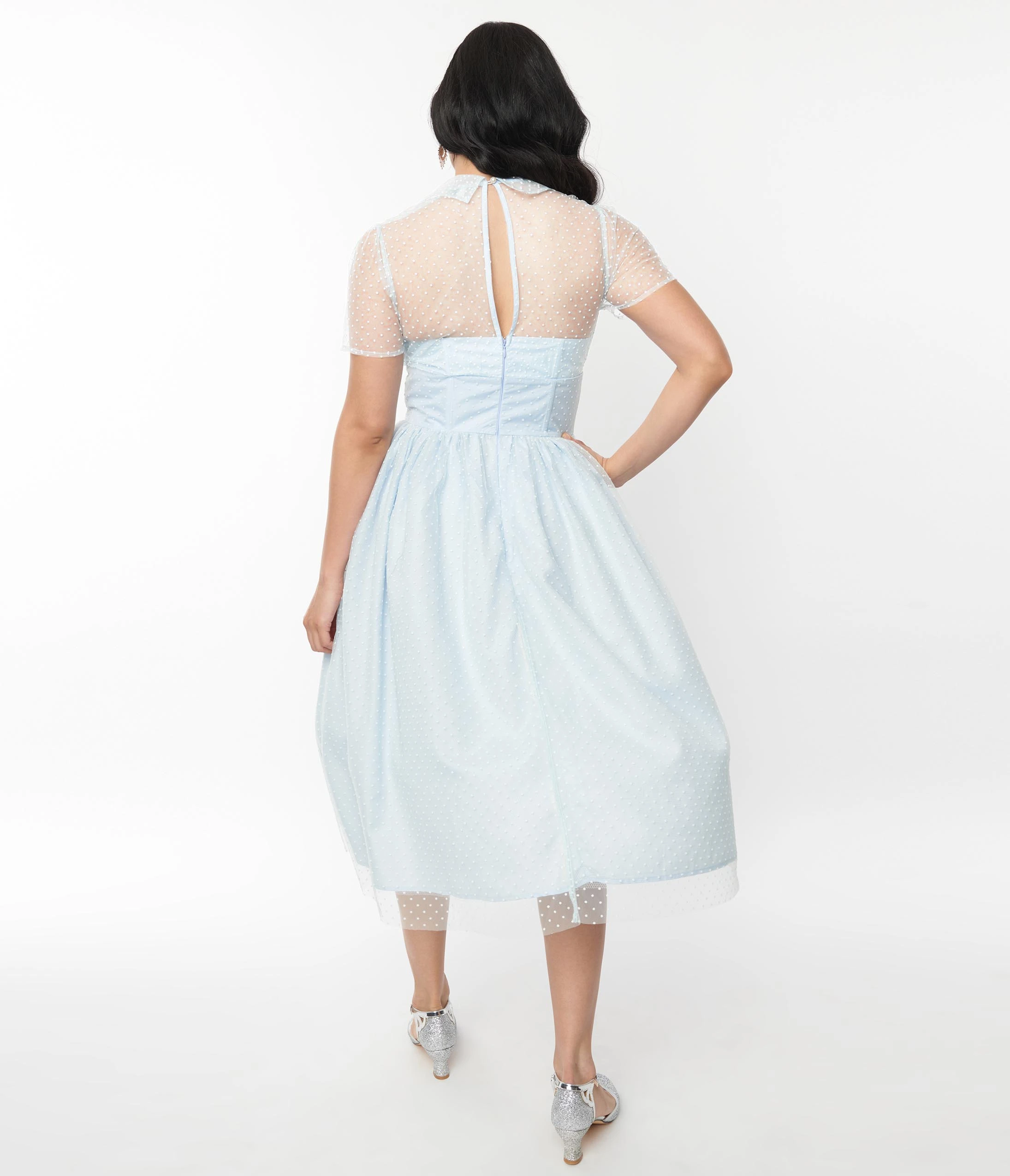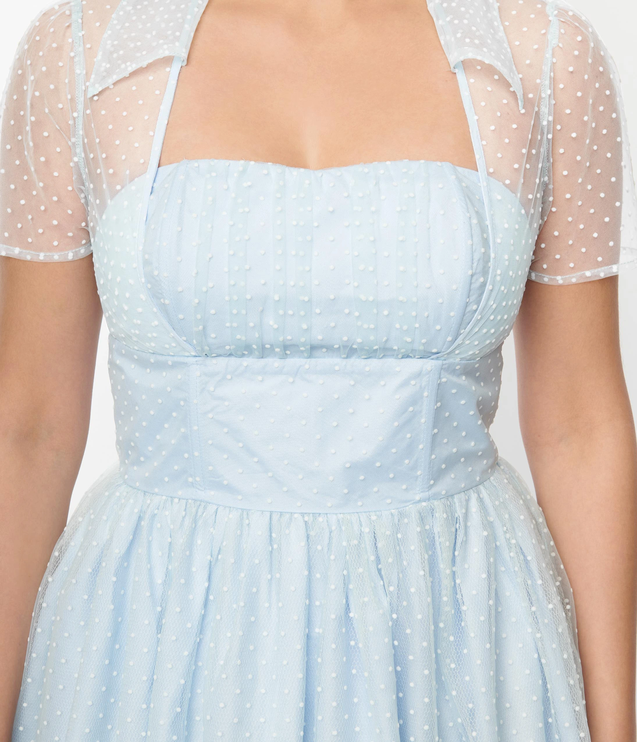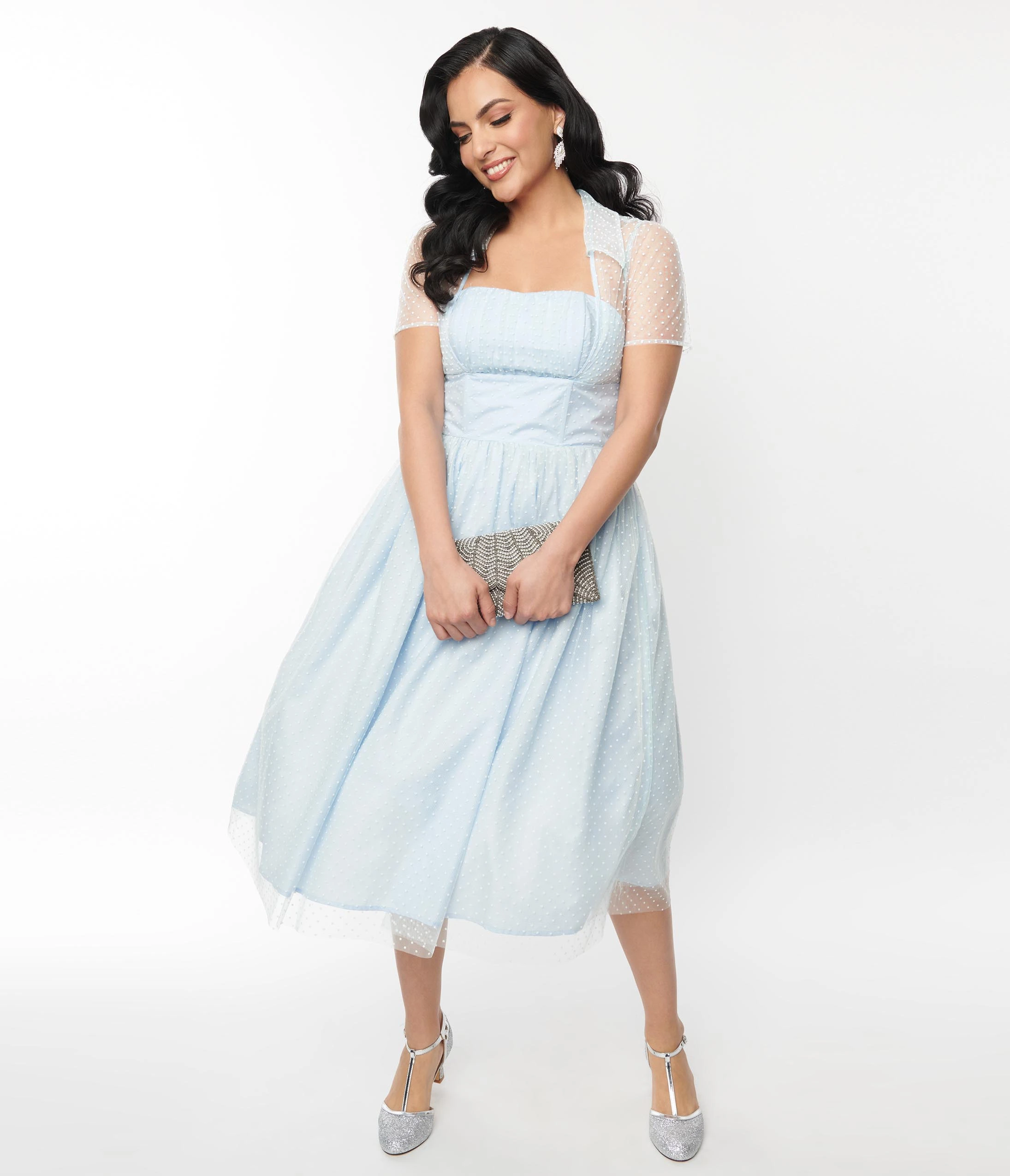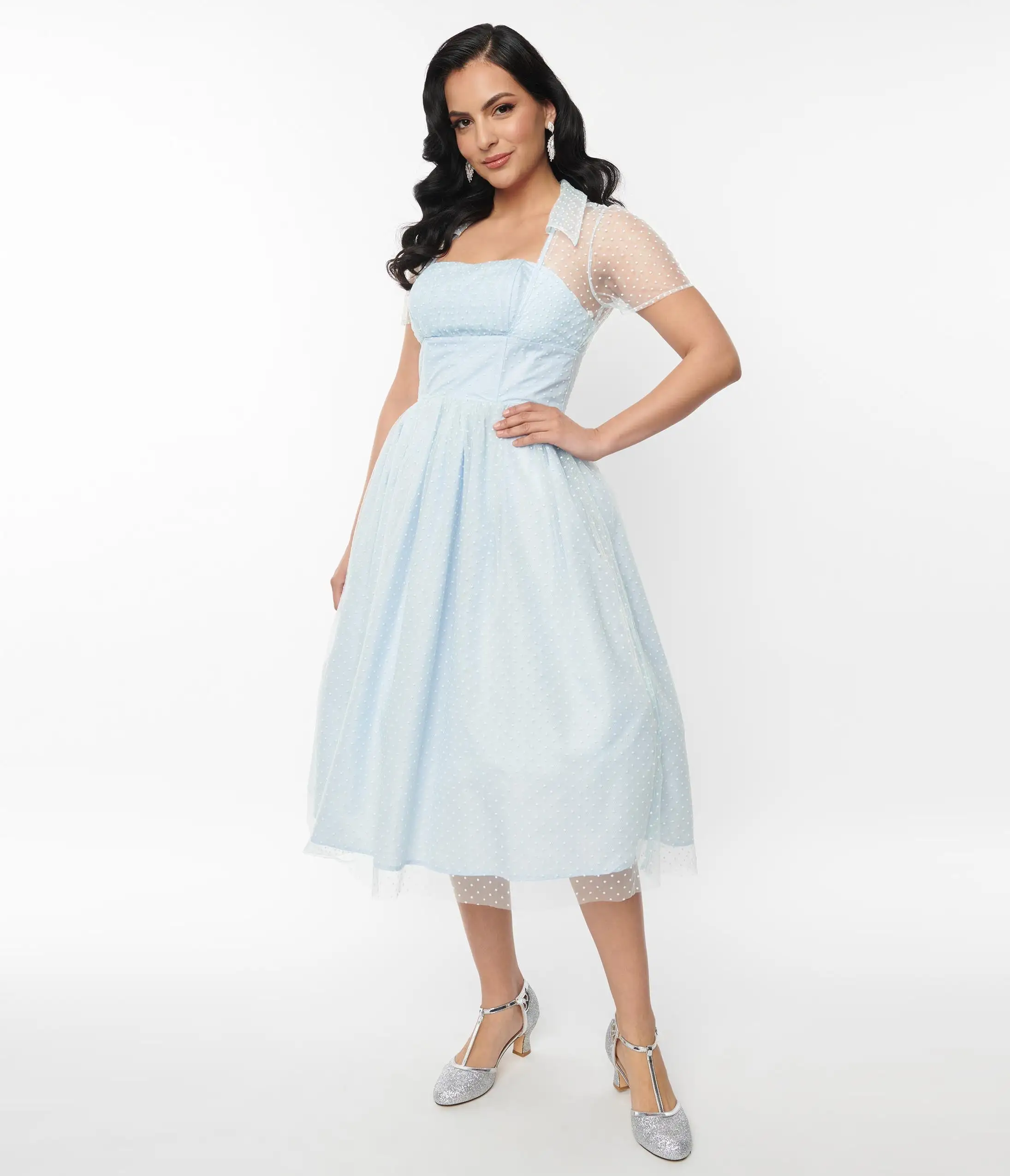 Aim for the sky, dears! Sweep them off their feet in the Libby Dress from Unique Vintage, a delightfully 1940’s style piece crafted in a marvelous light blue organza that dances with white dots throughout. The sweet heart bodice features subtle gathers over light blue lining and framed by elegant short sleeves while the banded waist is cinched with a back zipper and topped by a button keyhole. The gathered swing skirt cascades past your knees for a romantic silhouette!