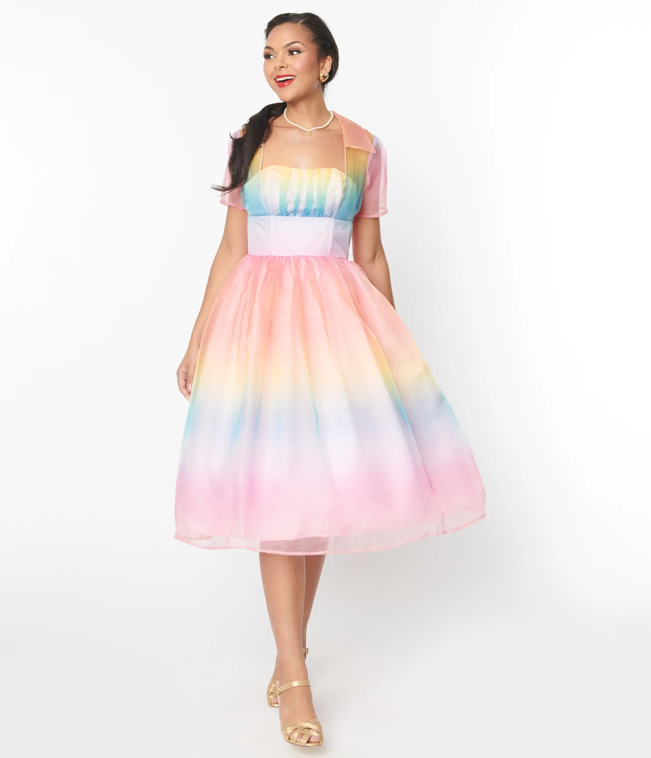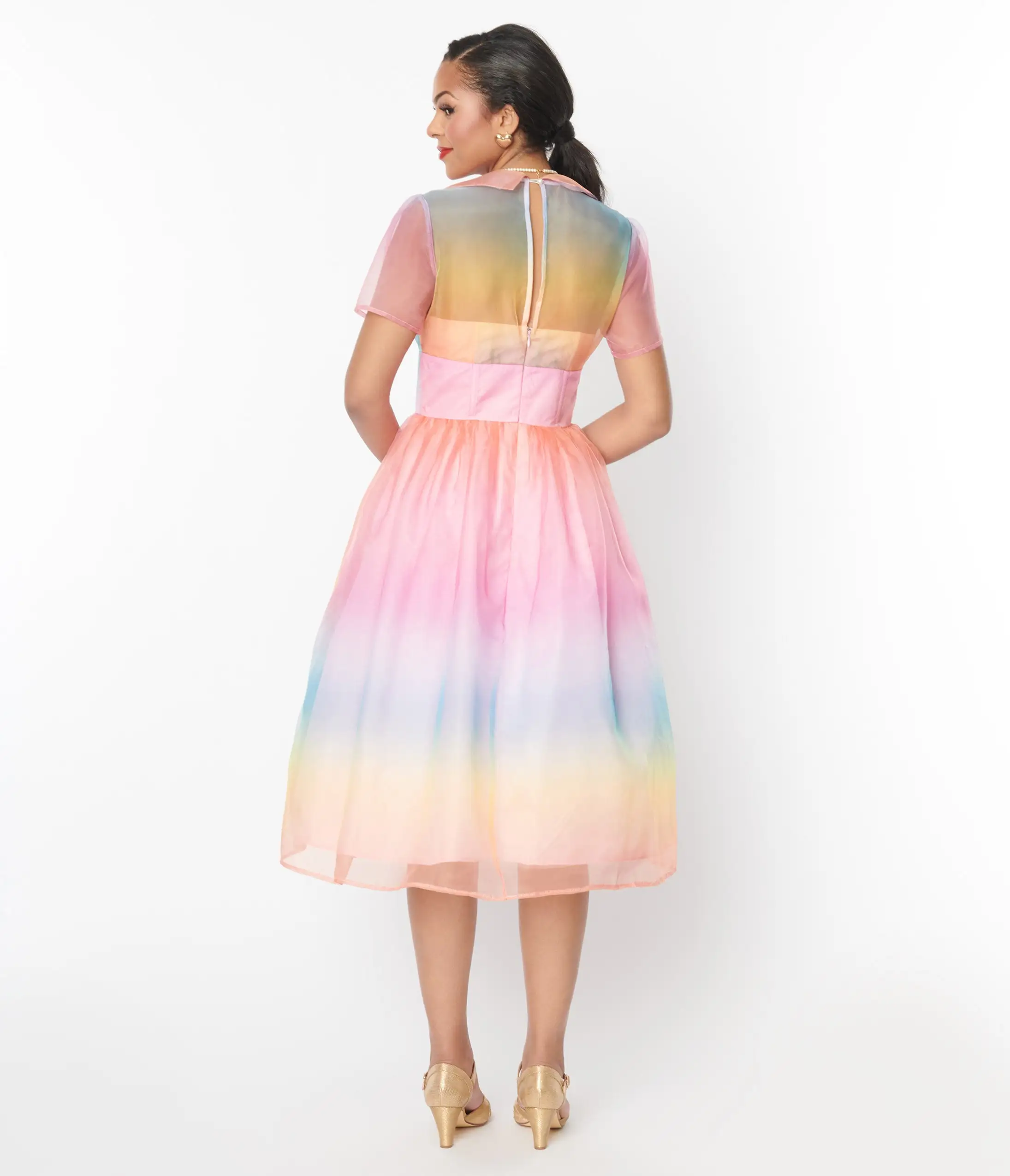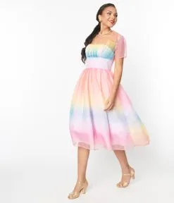 Aim for the sky, dears! Sweep them off their feet in the Libby Dress from Unique Vintage, a delightfully mid-century piece crafted in a marvelous pastel rainbow ombre poly organza. The sweetheart bodice features subtle gathers and framed by elegant short sleeves while the banded waist is cinched with a back zipper and topped by a button keyhole. The gathered swing skirt cascades past your knees over a light pink lining for a romantic silhouette!