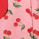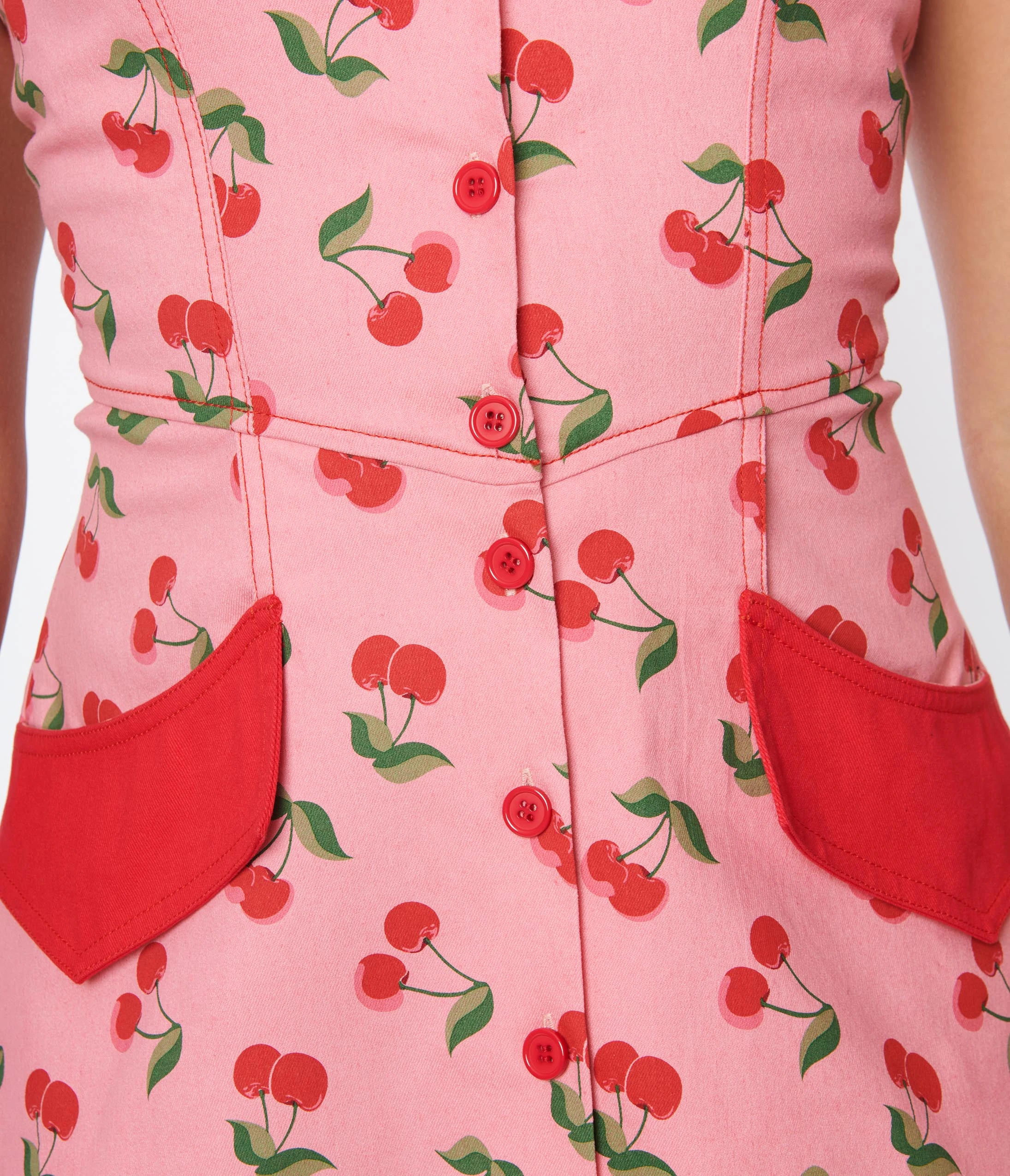 This flare dress is crafted in light pink denim and features a print of sweet red cherries throughout. Complete with a button up front and front pockets.