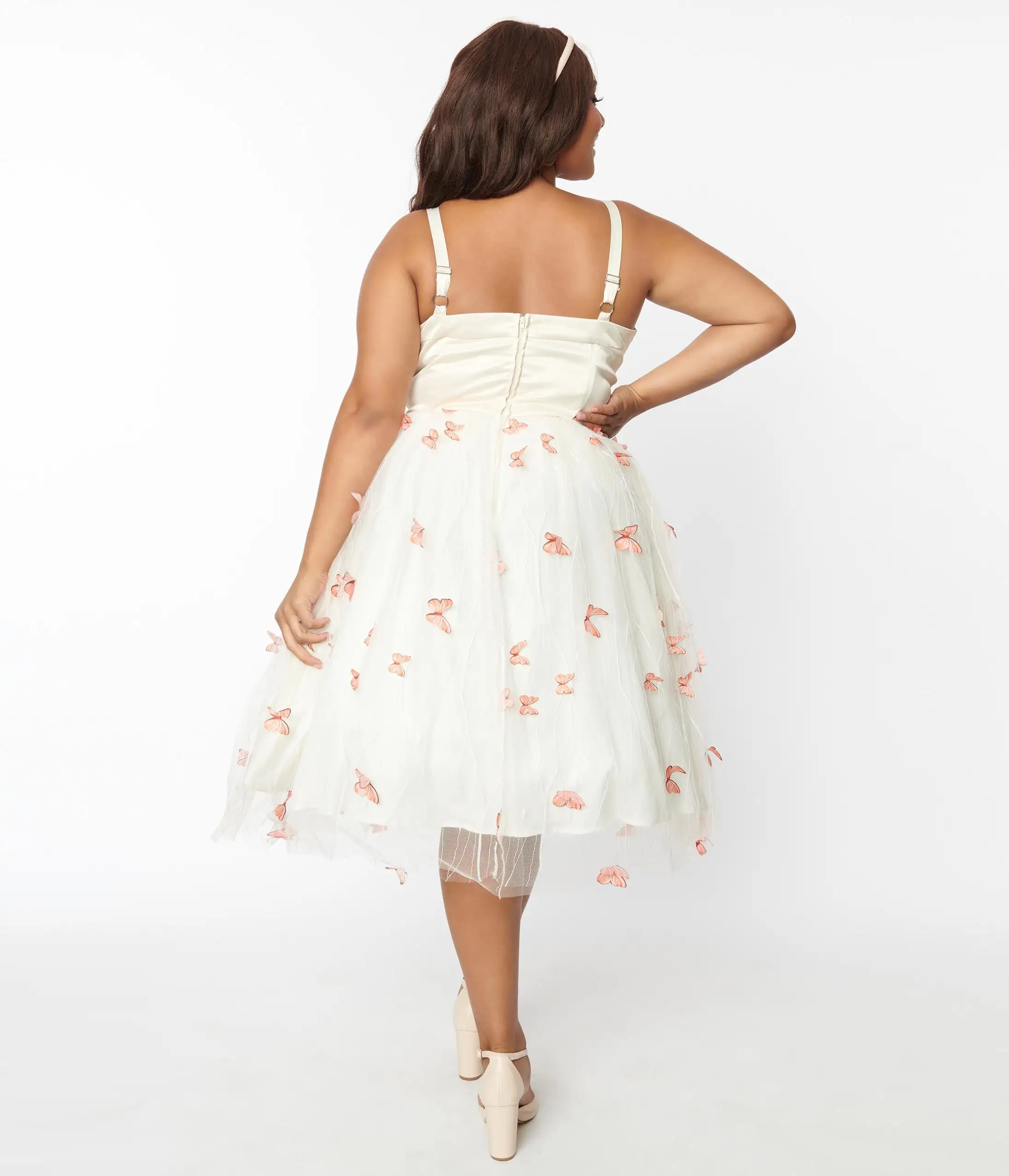 This plus size swing dress is crafted in a divine ivory tulle and boasts sweet fabric butterflies over an ivory lining. The black sweetheart bodice is supported by adjustable spaghetti straps, while the seamed waist is cinched with a back zipper.