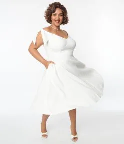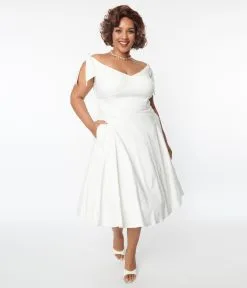 Make memories to last, gals! Watch them sing your praises in this rockabilly wonder from Unique Vintage. The plus size Prairie Dress is crafted in marvelous woven stretch blend that flatters your feminine form in a dazzling off white silhouette. The off the shoulder design features self tie shoulder straps while the seamed bodice is structured with subtle boning and cinched with a wide belt and back zipper to highlight your hourglass. Outfitted with a sweeping swing skirt and complete with side pockets for modern function!