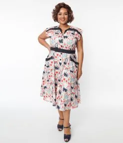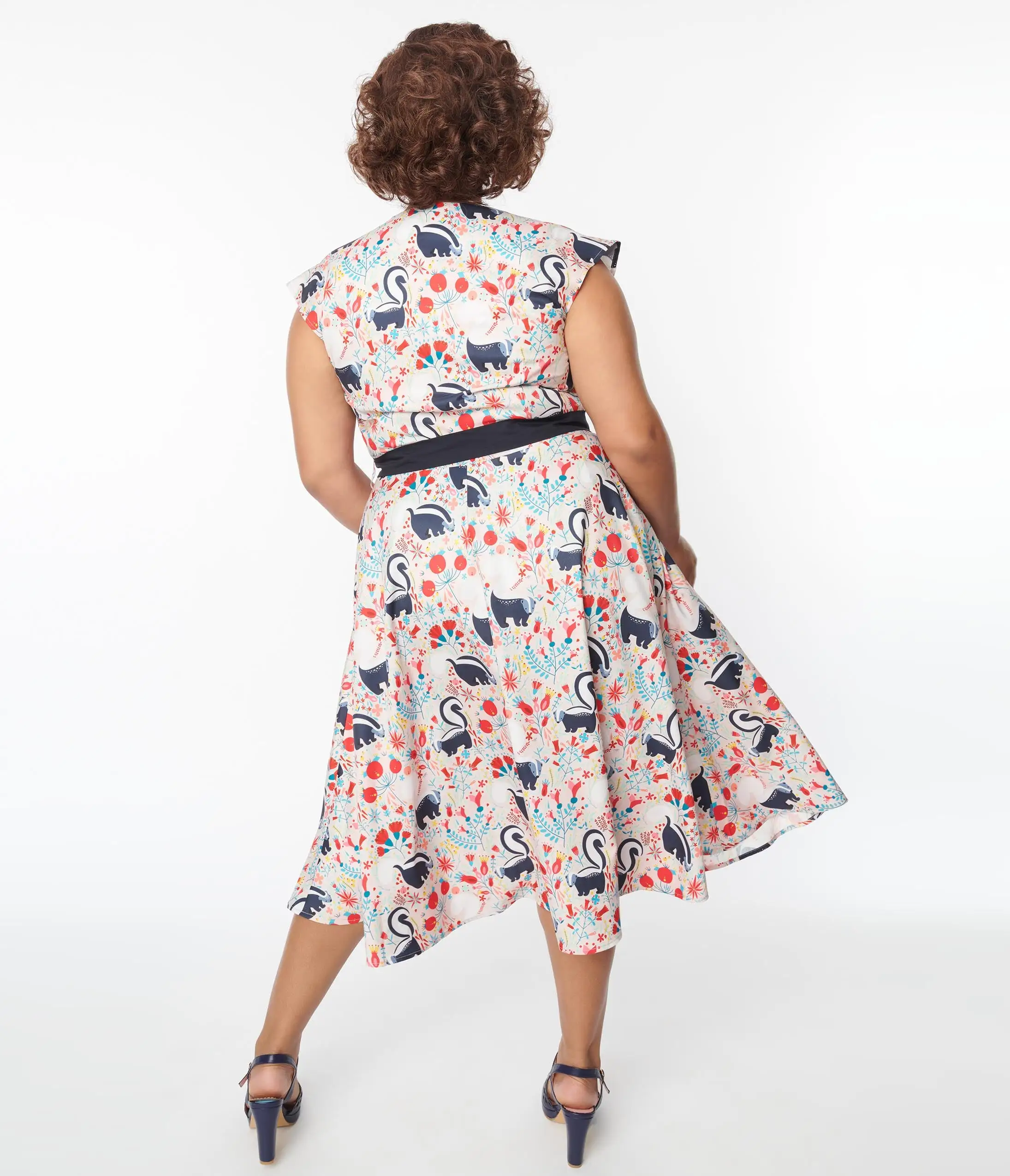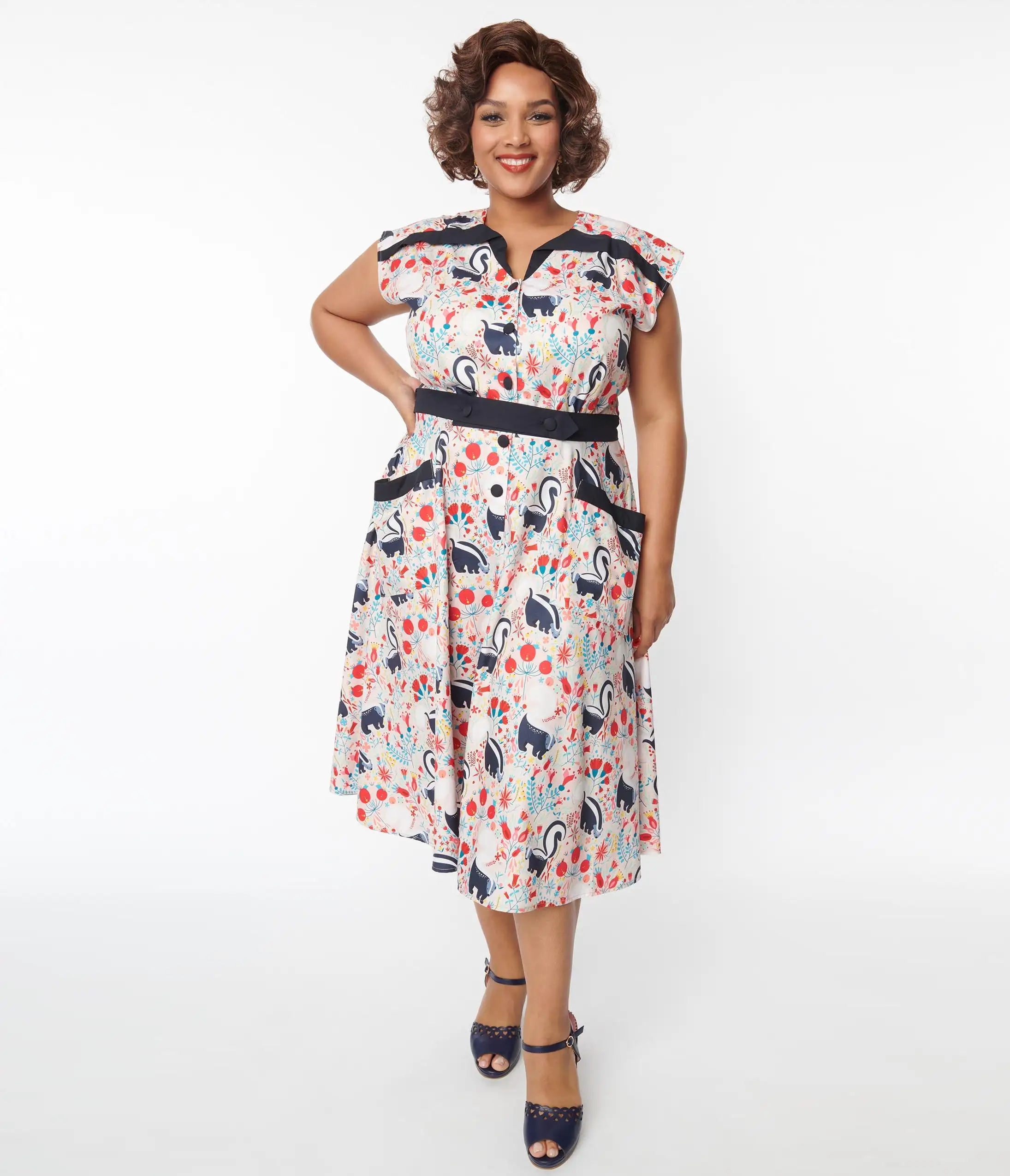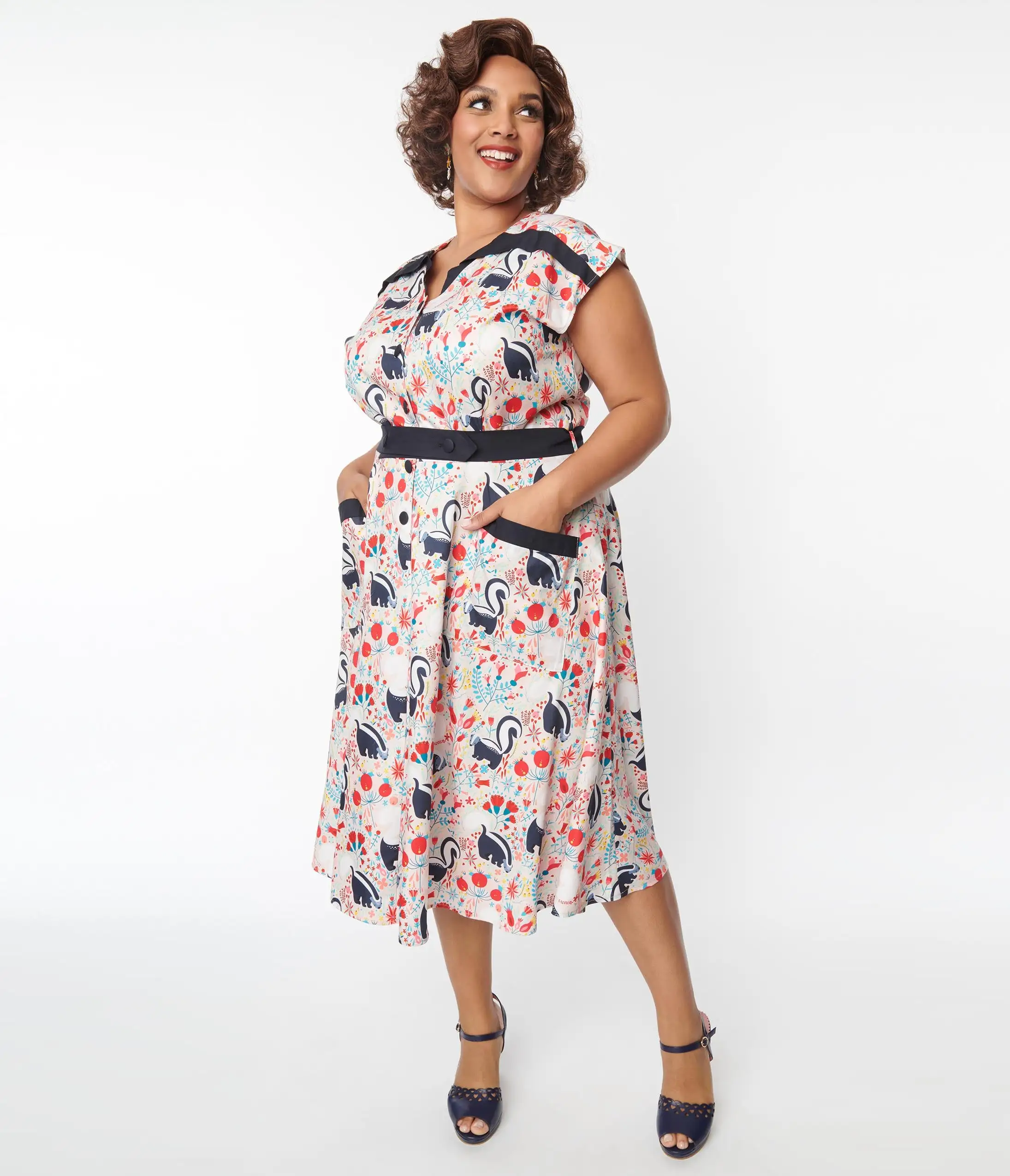 Strike up the conversation with Hedda, dames! Bursting with passion for mid-century flair, the plus size Hedda Dress from Unique Vintage is an exuberant piece that will have all the darlings applauding. Cast in a beautiful lightweight peach fabric, this charming swing dress features delightful highlights of navy that dance with adorable skunks printed throughout while fabric covered buttons secure the darted bodice. A modest V-neck is styled with a unique lapel collar that flairs out to the sweet cap sleeves and tops out above a darling double button belt to cinch in your hourglass. The A-line swing skirt sweeps to your knees while adorable front pockets keep your favorite accessories safe. There’s never been another like it!