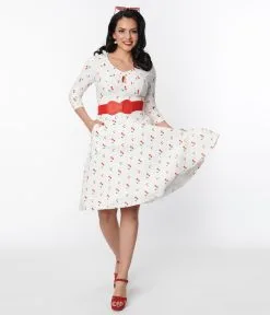Show off your infatuation in an enamored 1950’s inspired dress from Unique Vintage. This adorable swing frock is crafted in a white woven stretch blend that features cherries and black polka dots throughout and princess seams that are both comfortable and flattering. Complete with a keyhole neckline, three-quarter length sleeves and side pockets.